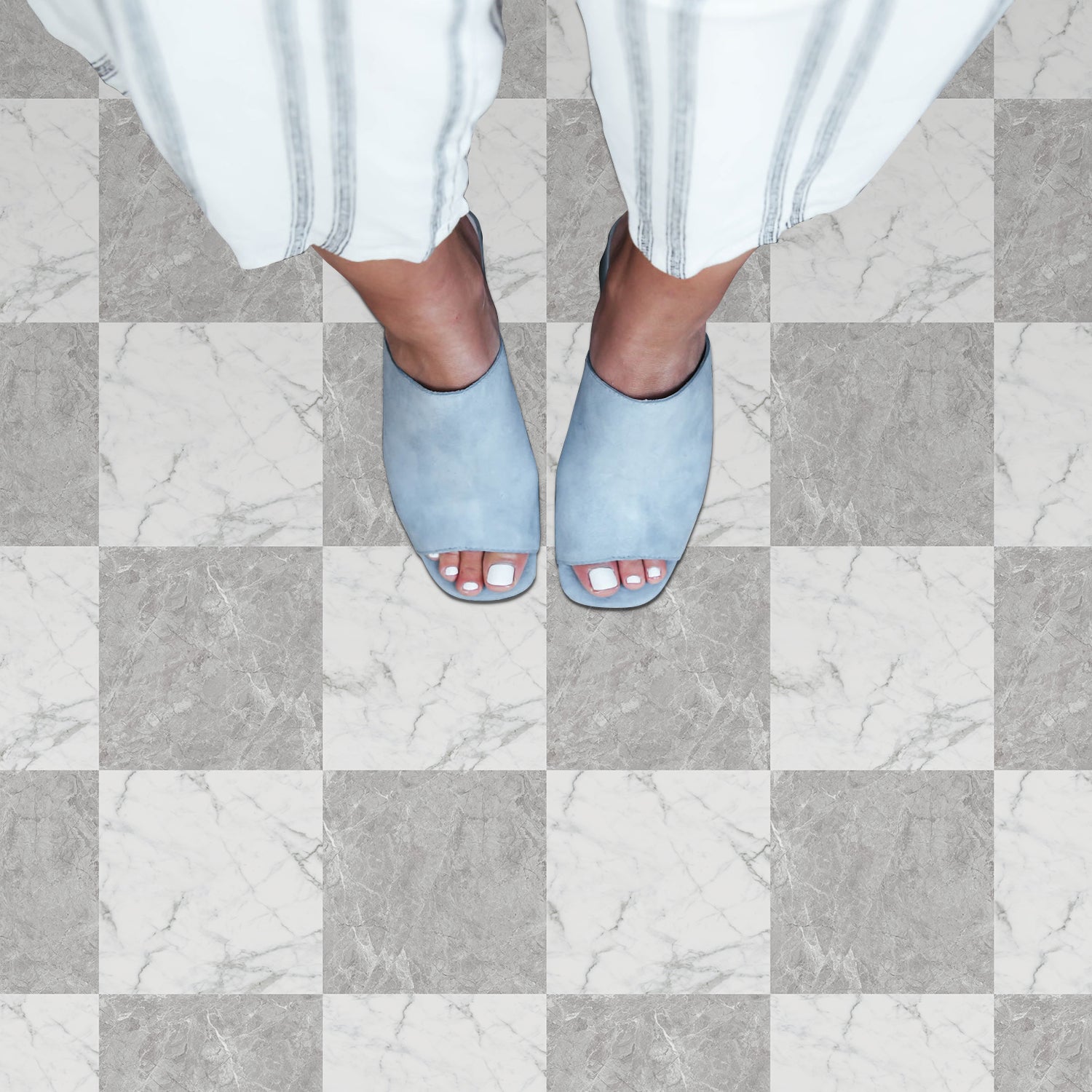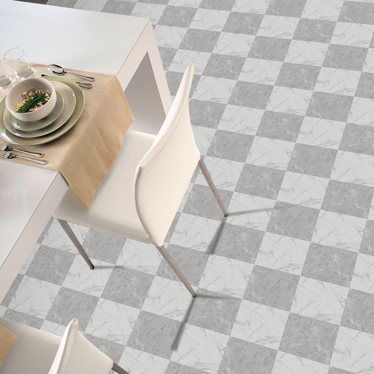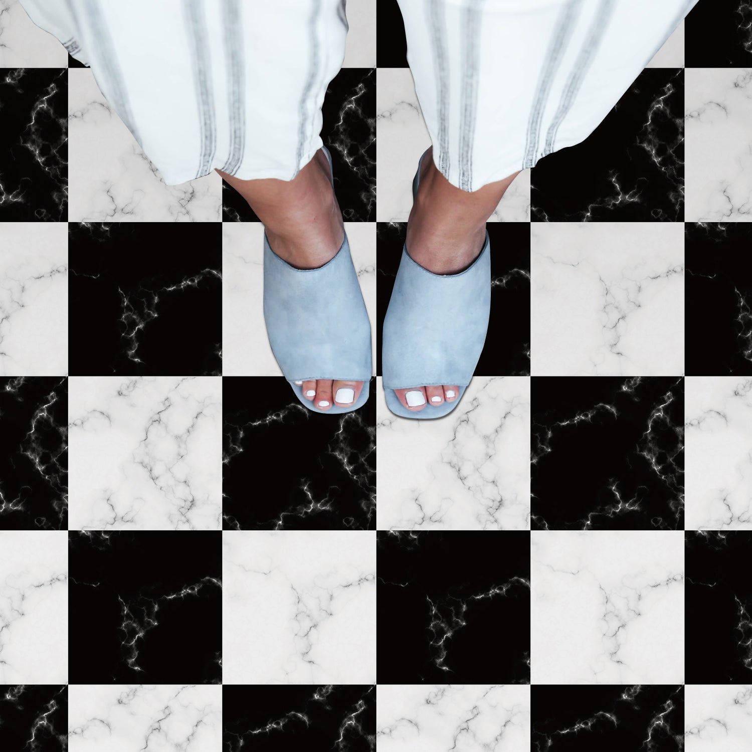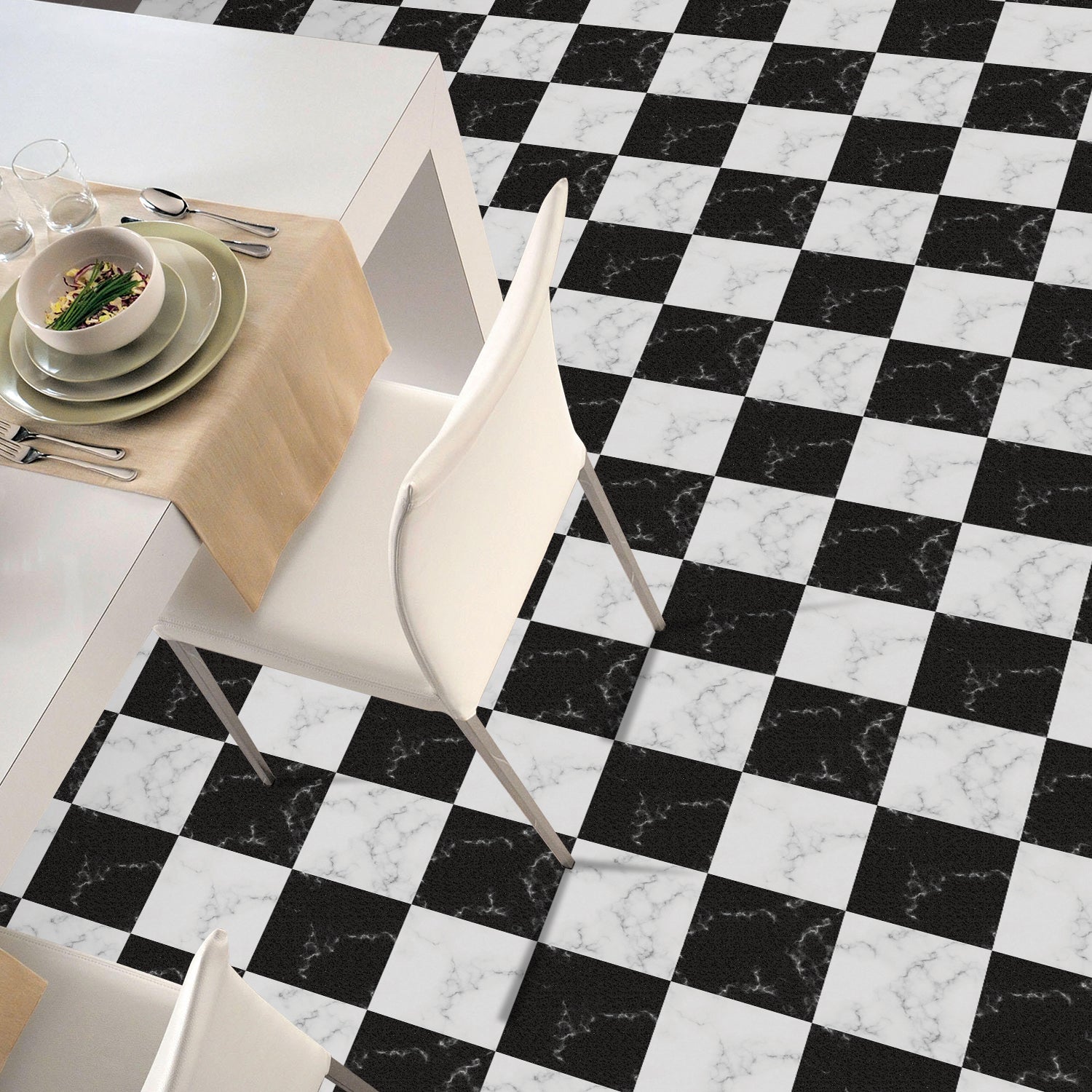 This marble splicing floor sticker embodies modern minimalist style, utilizing shades of black, white, and grey to highlight the space's structure and material texture while eliminating unnecessary decorations for a fresh aesthetic. The design achieves a simple, smooth pattern through expert marble splicing, reflecting minimalist principles.