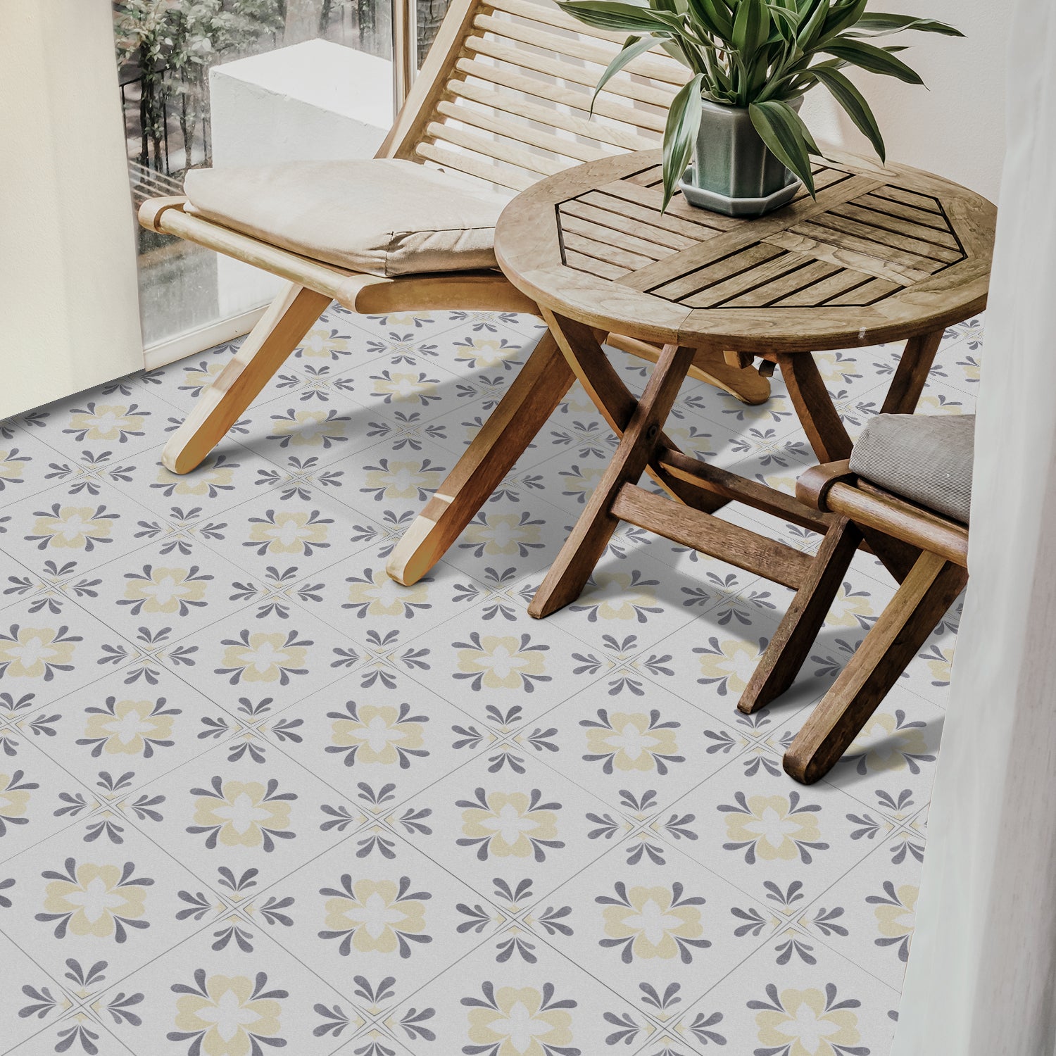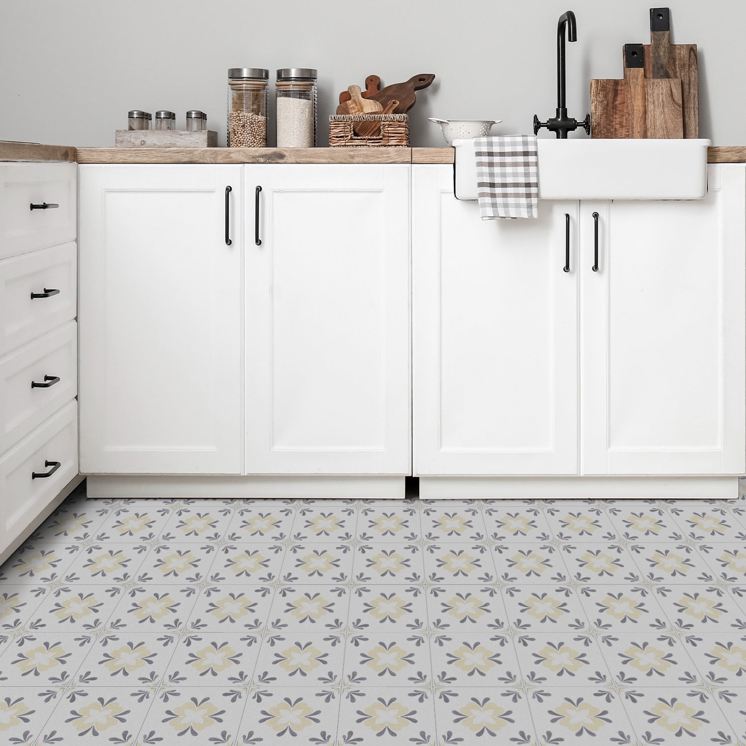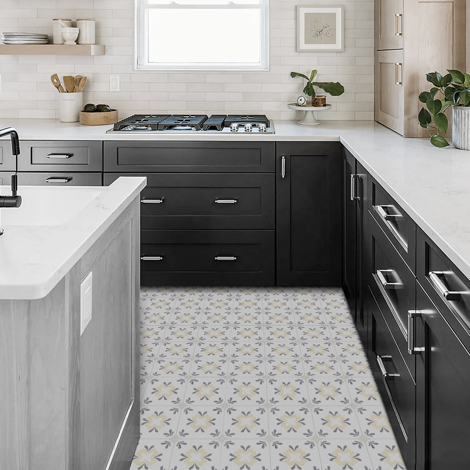 Beige grey floral pattern marble texture floor sticker, carefully blending the beauty of nature and the essence of modern design. The carefully carved large flowers in the centre of the pattern, like the elegance of the morning sun blooming, surrounded by streamlined delicate decorations, not only gives the product a dynamic sense of rhythm, but also shows a gentle but not lose the power of the soft beauty, so that every step in the rhythm of art.
