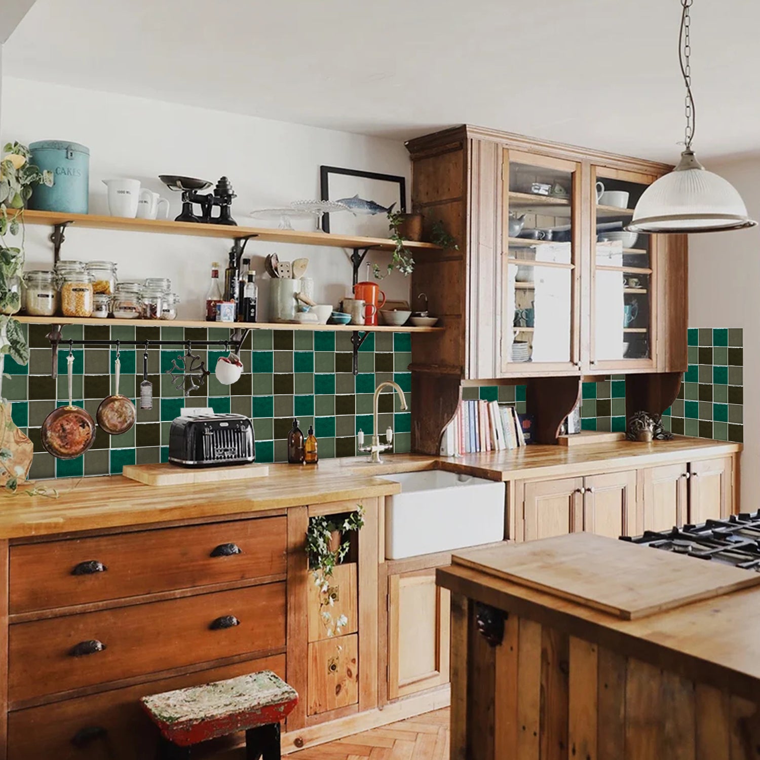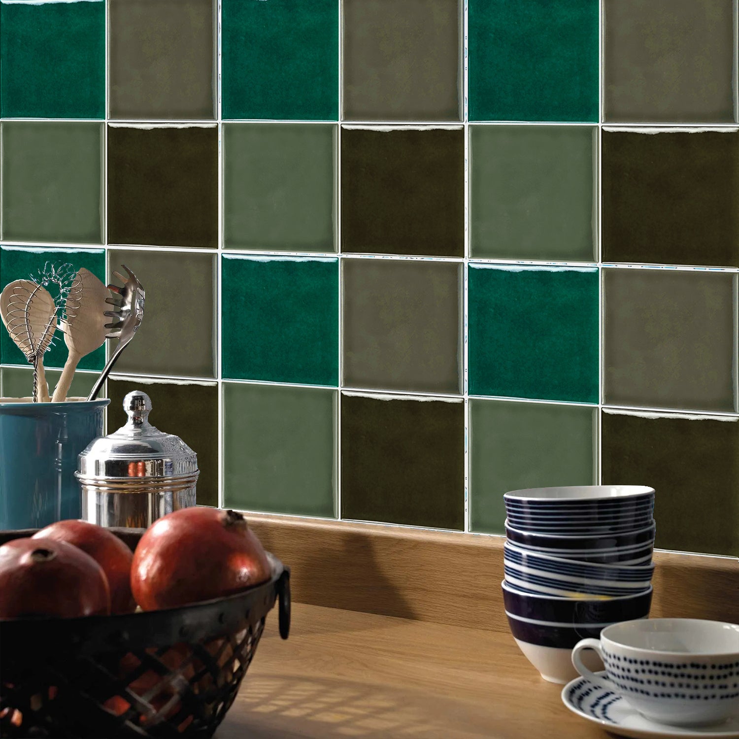 This tile sticker combines natural and modern elements, using green and grey intertwined chevron pattern, creating a fresh and elegant space atmosphere. Green symbolizes vitality and energy, injecting a touch of natural charm into the wall; grey brings a calm and introverted temperament, the two intertwined, both forming a sharp contrast, but also presents a harmonious aesthetic. The neat arrangement of the checkerboard pattern not only shows a rational sense of order, but also through the clean lines, enhancing the overall sense of design, making the tile stickers become a background wall rich in artistic atmosphere, adding a unique charm to the modern home space.